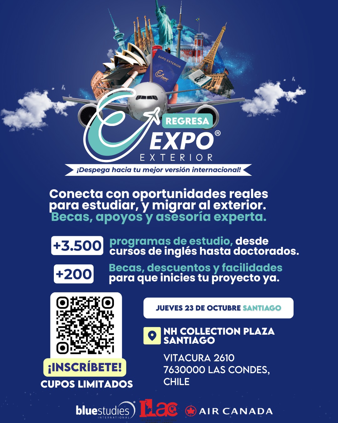 Evento externo que reunirá a universidades de todo el mundo, incluyendo Australia, Nueva Zelanda, España, Francia, Italia, Alemania, Canadá, Estados Unidos, Reino Unido, Irlanda, Malta, entre otros, con más de 15 destinos académicos destacados. Se llevará a cabo el 23 de octubre en NH Collection Plaza Santiago Vitacura 2610, Las Condes de 14:00 a 20:00 horas.
