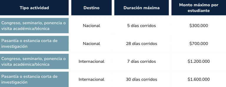 En la siguiente tabla se detallan los tipos de actividades, duración y montos máximos de financiamiento: