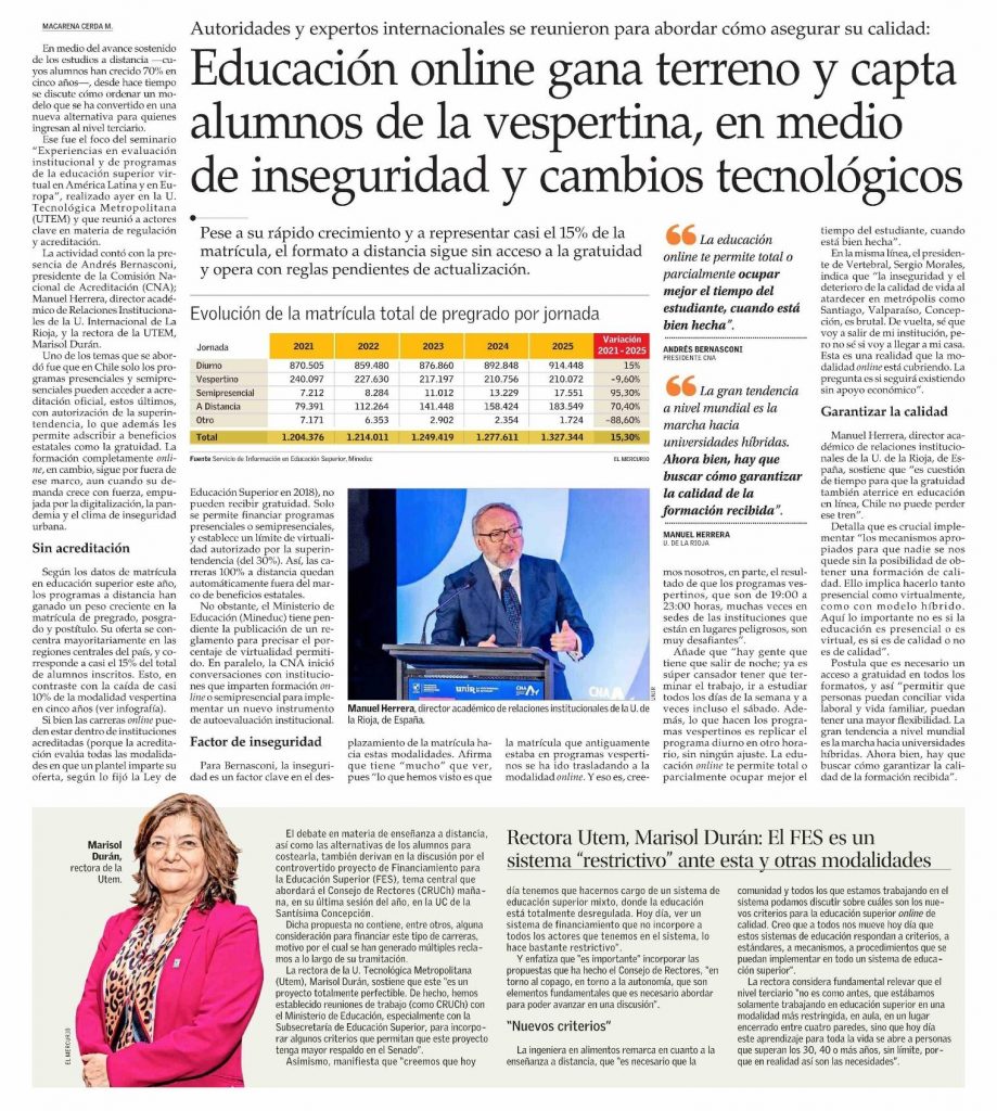 La Universidad Internacional de La Rioja (UNIR), la Universidad Tecnológica Metropolitana (UTEM), y la Comisión Nacional de Acreditación (CNA) de Chile organizaron el pasado martes 25 de noviembre, el Seminario “Experiencias en evaluación institucional y de programas de la Educación Superior Virtual en América Latina y Europa”, en Santiago, la capital de ese país.